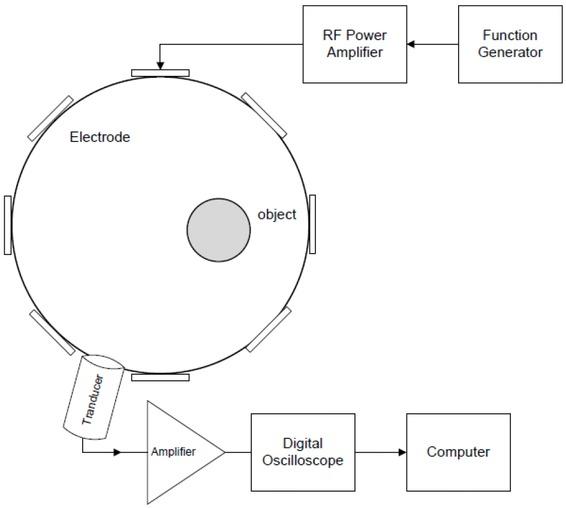 Wen and Balaban (2004) proposed the technique of electroacoustic imaging. The principle of electroacoustic imaging is an injection of voltage pulses on the object. The voltage pulse will transfer electrical energy to produce heat, which will be converted into acoustic pressure. The study used 400 Volt pulses with 300 ns width. The study dealt with electroacoustic imaging, but it was still limited to the acoustic signal, while the electric signal was not discussed.
