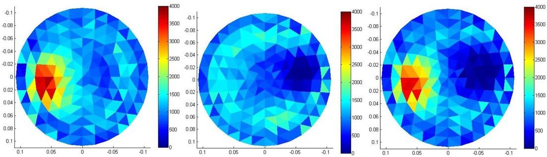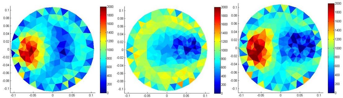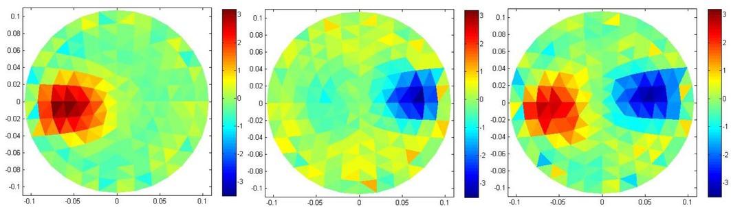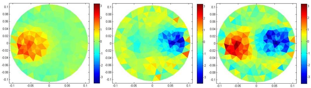 The experimental potential data in Figure 7 is reconstructed by linear methods and it will produce the reconstruction images in Figures 9 and 10. The reconstruction image of the relative method uses a uniform element model and alpha 0.01, while the non-uniform element models use an alpha of 0.006, 0.005, and 0.05 respectively.