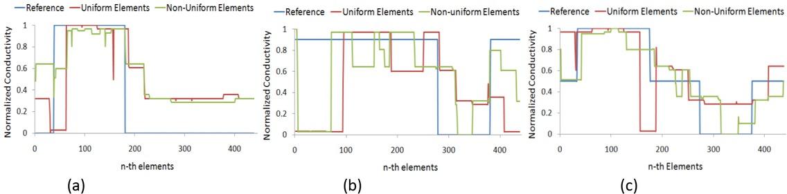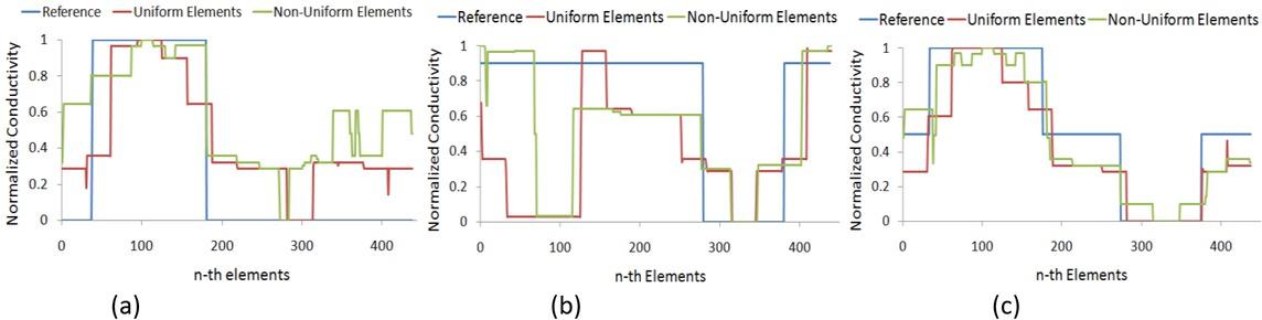 The line profiles of the reconstruction image from uniform and non-uniform elements compared to reference. (a) Insulator, (b) conductor, and (c) insulator-conductor