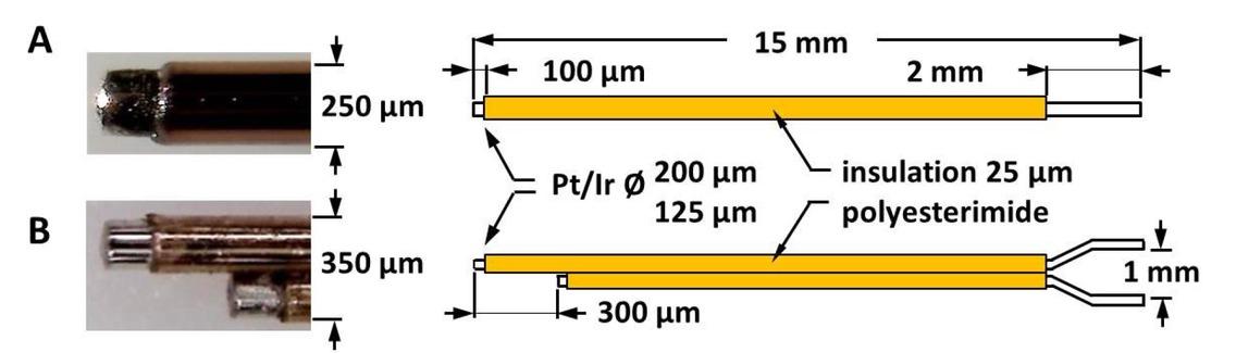 Photographs of tips (left) and schematic drawings (right) of (A) a unipolar electrode (200 μm wire diameter) and (B) a bipolar electrode (125 μm wire diameter). The electrode shafts were insulated with 25 μm polyesterimide. All electrode tips were bared for 100 μm.