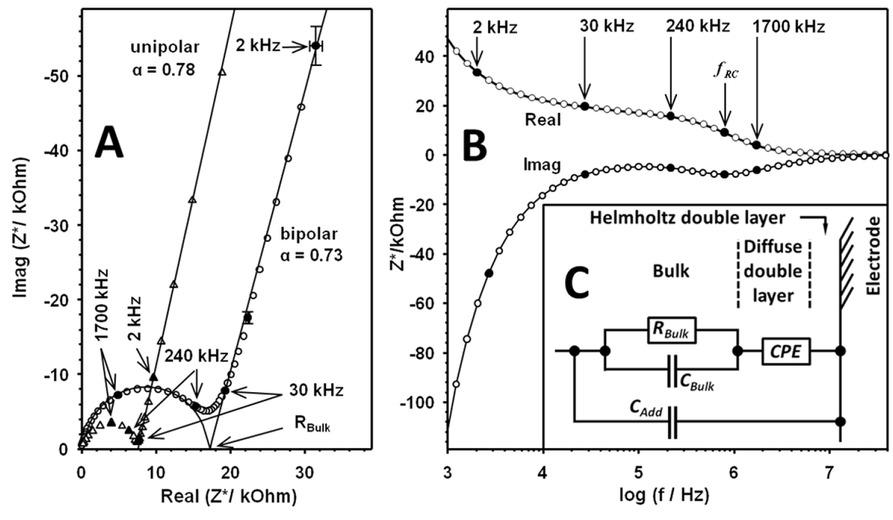 For the calibration solution with a conductivity of σCal = 0.1307 Sm-1 and a relative permittivity of εrel = 80, the Maxwell-Wagner frequency is approx. 29 MHz. This frequency would also be obtained from RBulk , CBulk and the generalized cell constant γ. Nevertheless, from the semicircles of the bipolar and unipolar electrodes in Figure 2A, characteristic frequencies of 825 kHz and 1.79 MHz were identified. The explanation of these experimental deviations requires higher capacitive contributions than predicted by equation (3) (see subsequent discussion).