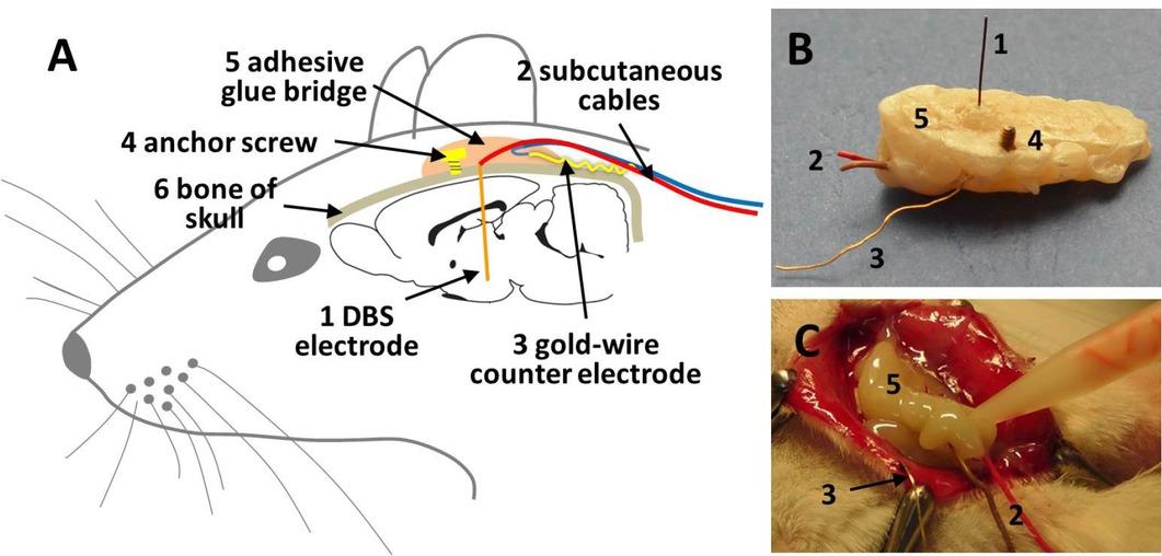 Implanted unipolar DBS electrode with gold-wire counter electrode. (A) Scheme of a sectional plane through the scull with: (1) unipolar Pt/Ir electrode, (2) connecting cables of stimulating and counter electrode, (3) gold-wire counter electrode, and (4) anchor-screw that was tightened to the skull on the left hemisphere. All components were embedded in an adhesive-glue bridge of biocompatible dental acrylic (5) that fixed the mounting to the skull. (B) Explanted DBS mounting. (C) Details of the surgical treatment. The operational area is spread by surgical clips. The connecting cables of the stimulating and counter electrodes are covered with biocompatible dental acrylic.