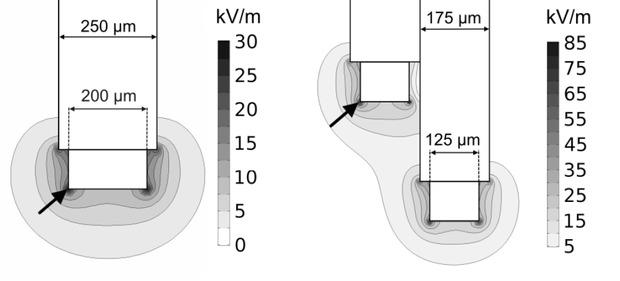 Figure 5 illustrates simulated distributions of the electric field around both electrode types. Please note that the values were calculated with average mesh sizes of approx. 16 μm (unipolar electrode) and 10 μm (bipolar electrode). This size is of the order of the effective cell-soma size of approx. 10 μm.