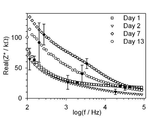 In vivo changes in Real(Z*) for bipolar electrodes in the frequency range of 100 Hz to 100 kHz over 13 days. A characteristic decrease at the second day after implantation was identified in each of the four animals used in the experiments. For a clearer presentation, SEMs are only provided for the filled points as examples.