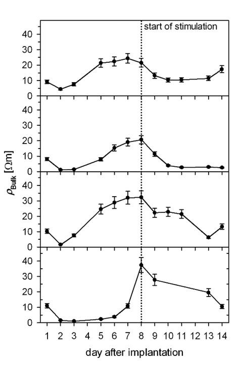 Figure 8 summarizes the resistivities of the bipolar and unipolar electrodes for two weeks after implantation. The resistivities of the brain tissue around the tips were similar for both electrode types and exhibited characteristic time-courses. Nevertheless, the mean resistivities of the bipolar electrodes changed within a substantially larger range (between approx. 2.2 and 28 Ωm) compared with the unipolar electrodes (between approx. 4.6 and 9.2 Ωm). Typically, the resistivities decreased at the second day after implantation, followed by an increase. The initiation of the DBS stimulation at day eight resulted in another resistivity decrease.