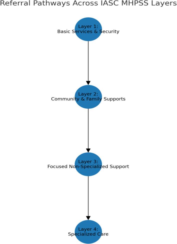 Referral Pathways Across IASC MHPSS Layers: This figure presents a simplified representation of referral pathways within the IASC MHPSS intervention framework. In practice, these pathways are non-linear and often overlapping. Individuals in need of specialized services may simultaneously benefit from lower-layer interventions, such as community-based support groups and basic services that uphold dignity and promote social inclusion.